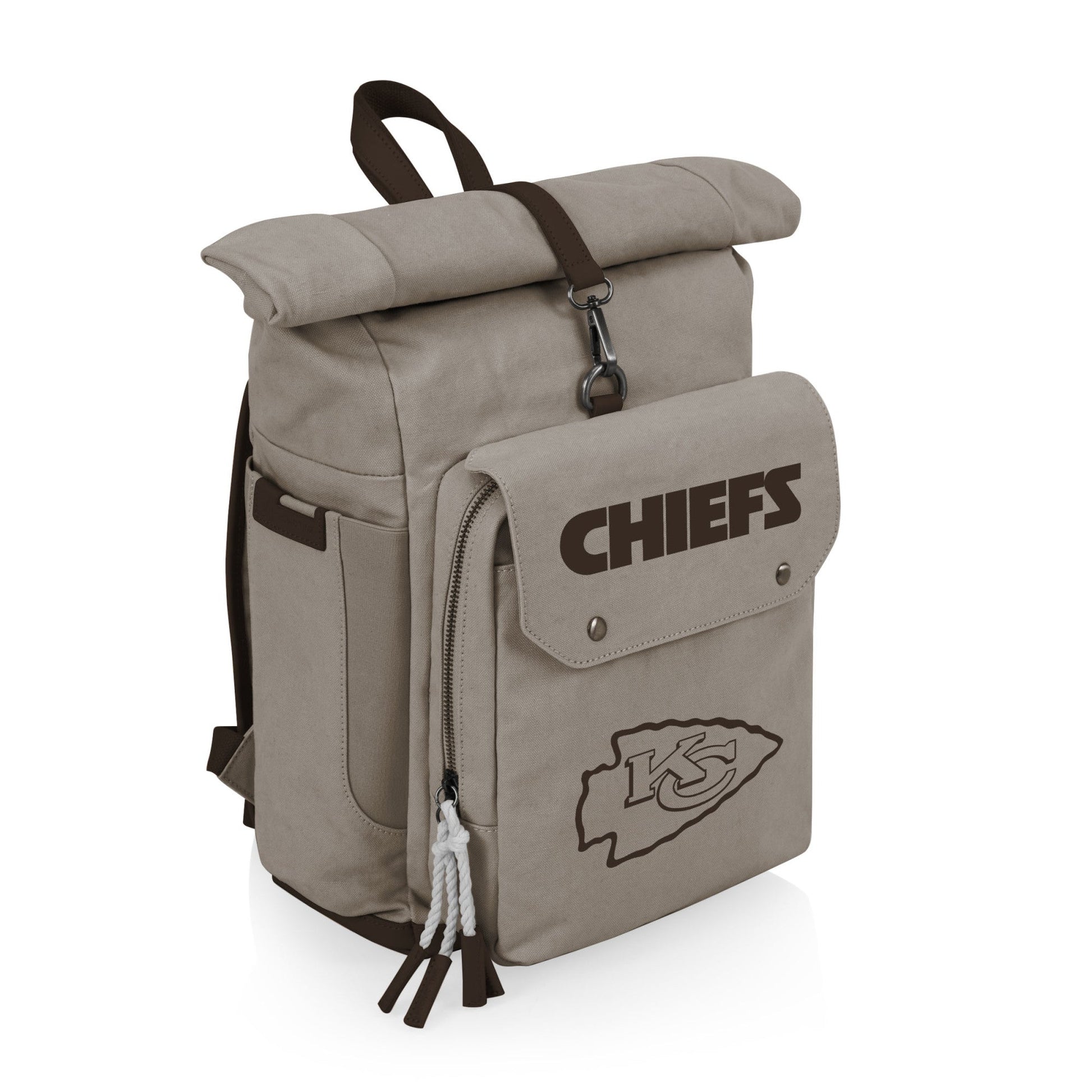 The Kansas City Chiefs Carmel Roll Top Picnic Backpack Cooler brings together a certified recycled Cotton canvas exterior with a waterproof, insulated, eco-friendly interior to create one stylish and functional package. But wait - that’s not all! The component pocket in this soft cooler bag can easily store all the pic
